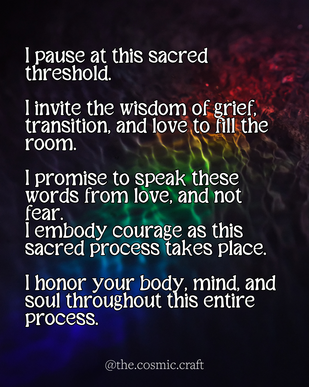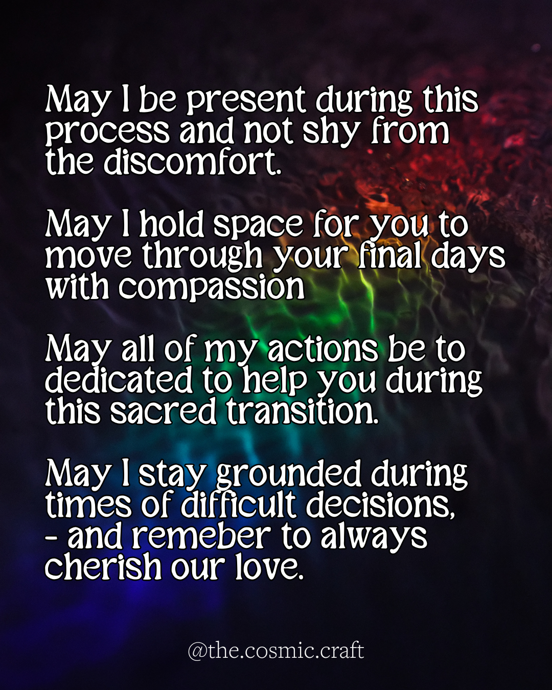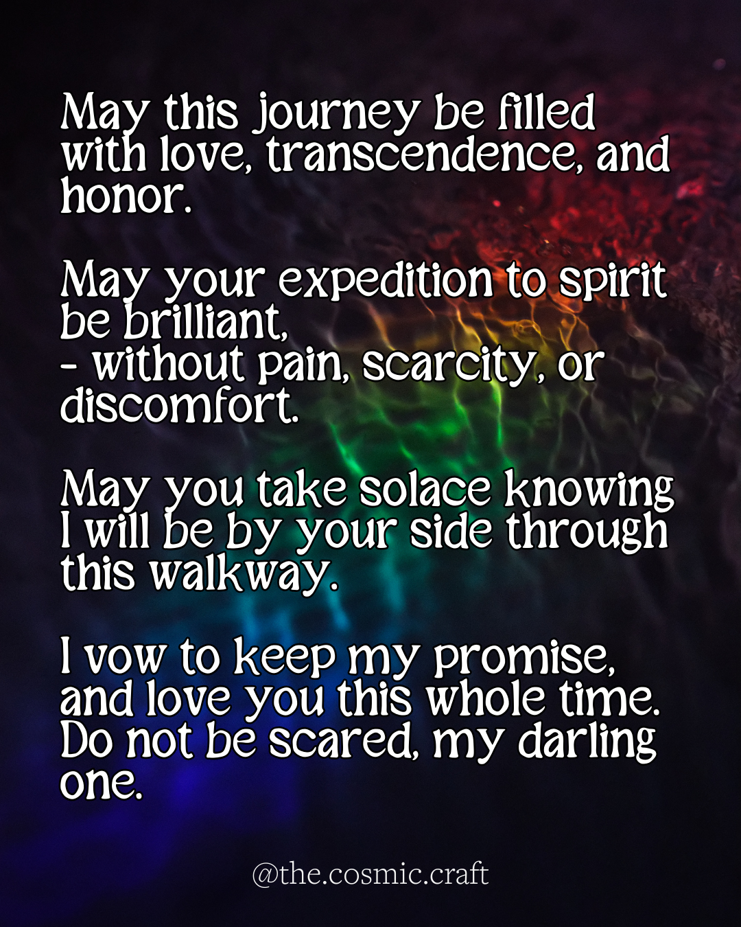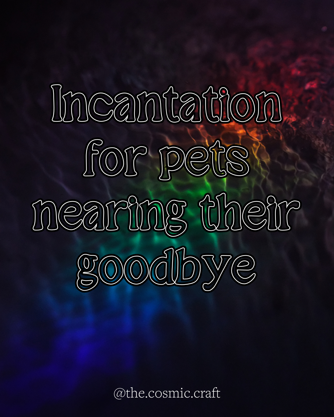 Below, you’ll find an incantation, a prayer, some words of affirmation for your pet nearing their transition to the other side. I believe they’re all similar in action, but go by different names. This prayer is deeply spiritual, but not religious. You can choose one image that feels the best, or say them one after the other to create a sacred space around you and your pet.
