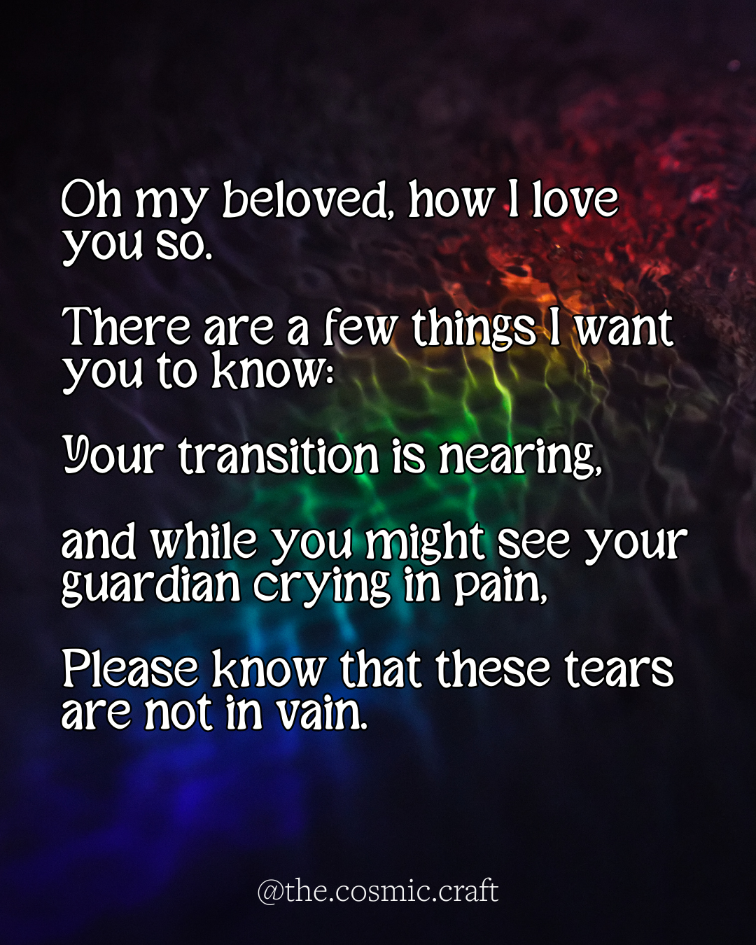 Your transition is nearing, and while you might see your guardian crying in pain,